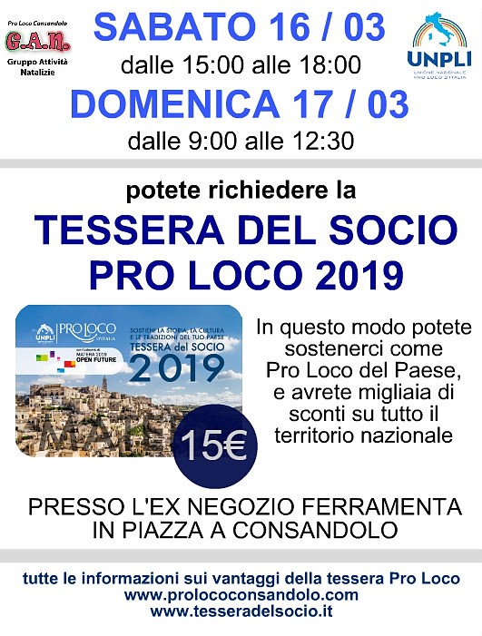 Nelle giornate di Sabato 16 (dalle ore 15:00 alle 18:00) e Domenica 17 (dalle 9:00 alle 12:30), presso l’ex negozio ferramenta in Piazza a Consandolo, potrete ritirare la vostra tessera Socio Pro Loco 2019 al costo di 15€. Basterà rivolgersi ai nostri ragazzi volontari e compilare il modulo con i propri dati personali. Inoltre, durante le due giornate, resteremo a disposizione anche per i rinnovi tessera di chi è già socio e per qualsiasi altra informazione riguardante i vantaggi della tessera.